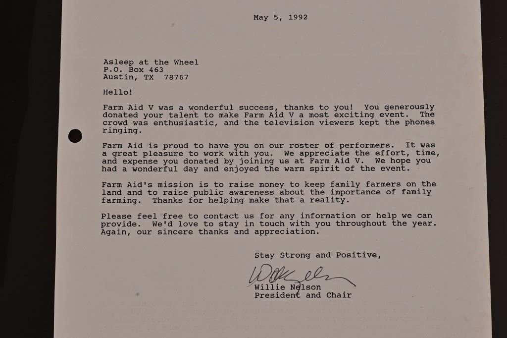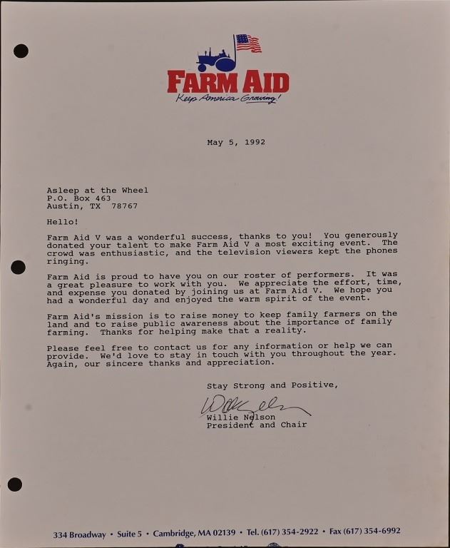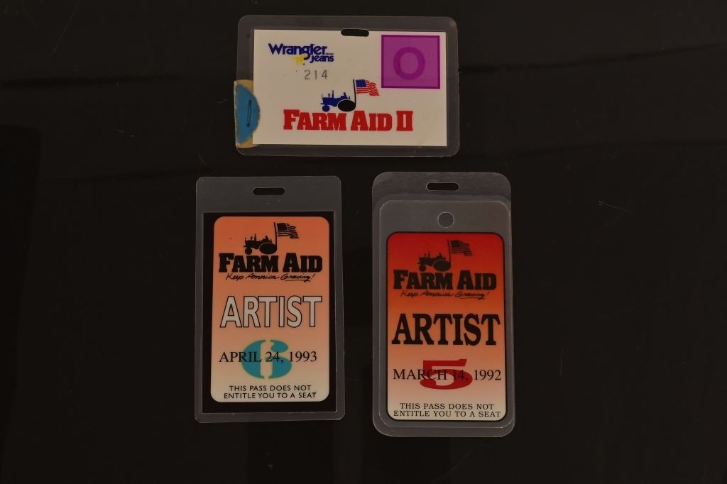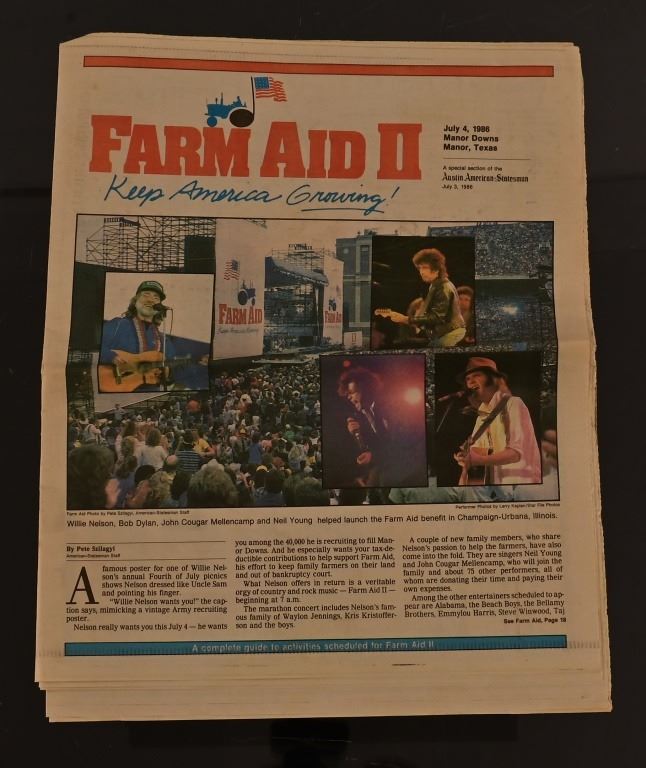 Willie Nelson signed Farm Aid letter, credentials. & Farm Aid II paper. Farm Aid II was held at Manor Downs in Manor, Texas on July 4, 1986. Includes Farm Aid II Badge #214 Sponsored by Wrangler Jeans. A special section of The Austin American-Statesman on Farm Aid II published July 3, 1986. From Ray Benson's personal collection.