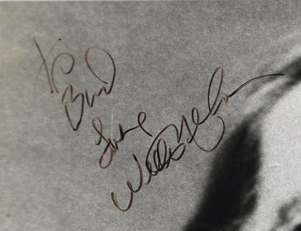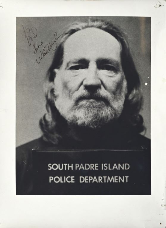 Signed "To Bud, Love Willie Nelson". South Padre Island Police Department. 11" x 14". From the personal collection of Bud Shrake
