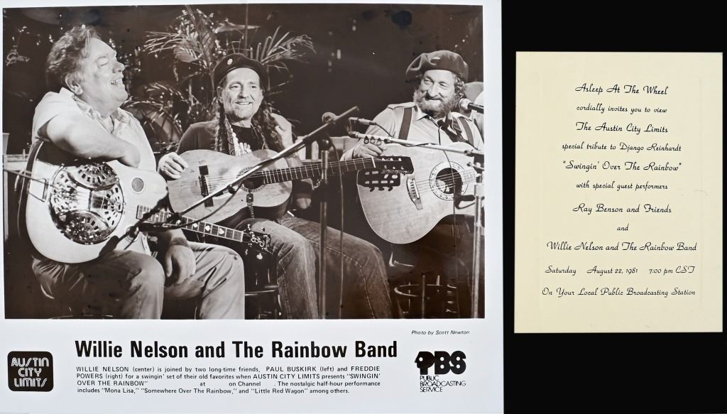 Austin City Limits photo & invitation card for Willie Nelson And The Rainbow Band. Photo measures 8" x 10", invitation card measures 4.25" x 5.5". With artist pass from "An Evening With Willie Nelson, Ray Benson, and Special Friends." April 24, 1981. From Ray Benson's personal collection.