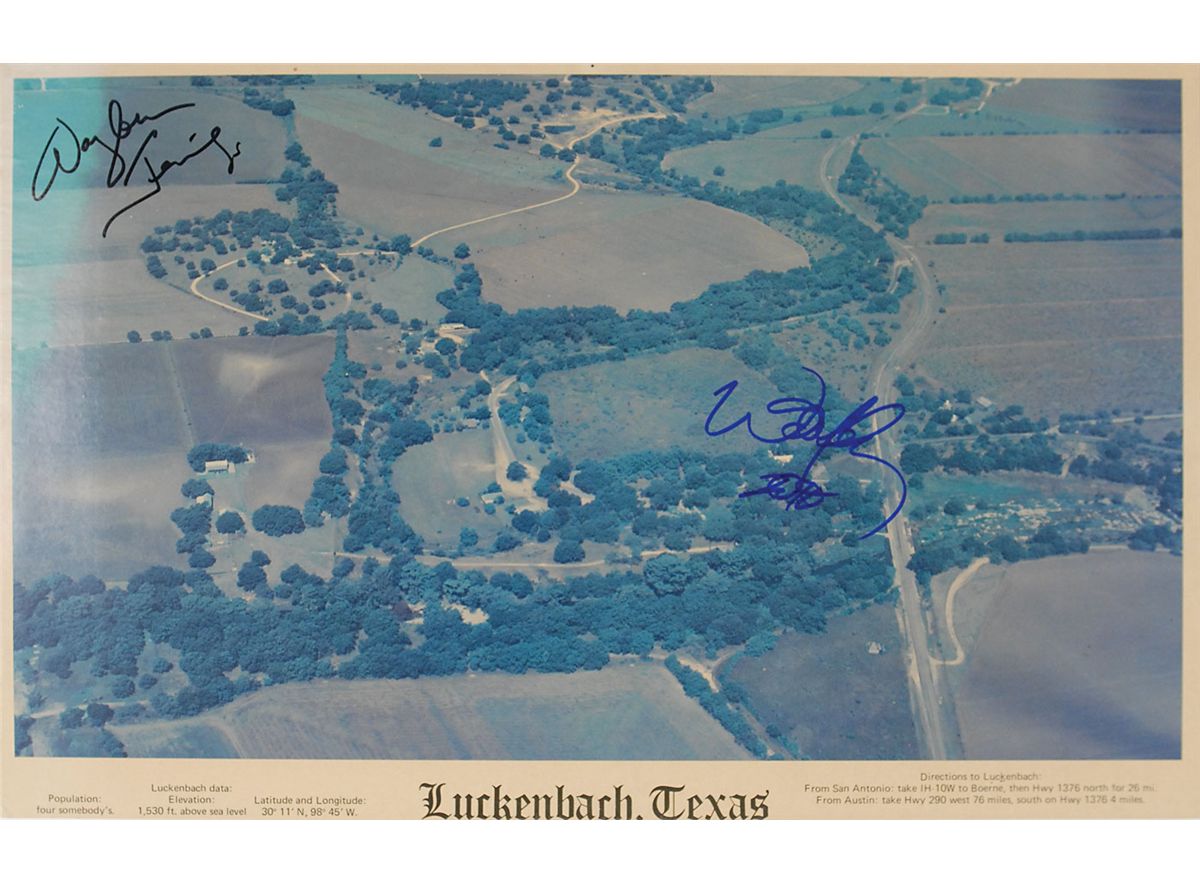 Color 17 x 10.75 aerial photo of Luckenbach, Texas, signed in blue felt tip by Willie Nelson and in black felt tip by Waylon Jennings. Photo is affixed to an identical size mount. In fine condition, with a couple of tack holes to top edge. Nelson and Jennings memorialized Luckenbach with the song ‘Luckenbach, Texas (Back to the Basics of Love).’