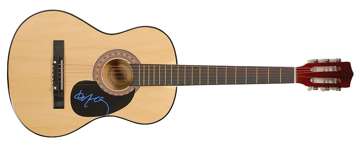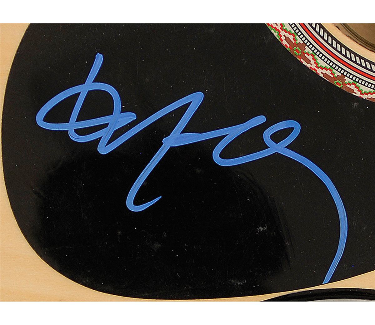 Natural wood-finish six-string acoustic guitar, signed on the black pickguard in blue ink. In fine condition. Oversized.