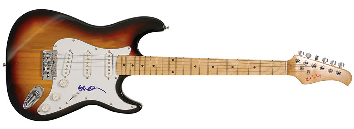 Sunburst-finish OSM ‘stratocaster-style’ electric guitar, signed on the white pickguard in blue felt tip. In fine condition. Oversized.