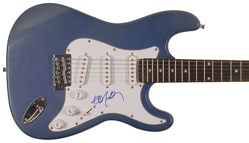 Black-bodied Crescent ‘stratocaster-style’ electric guitar, signed on the white pickguard in blue felt tip. In fine condition. Oversized.