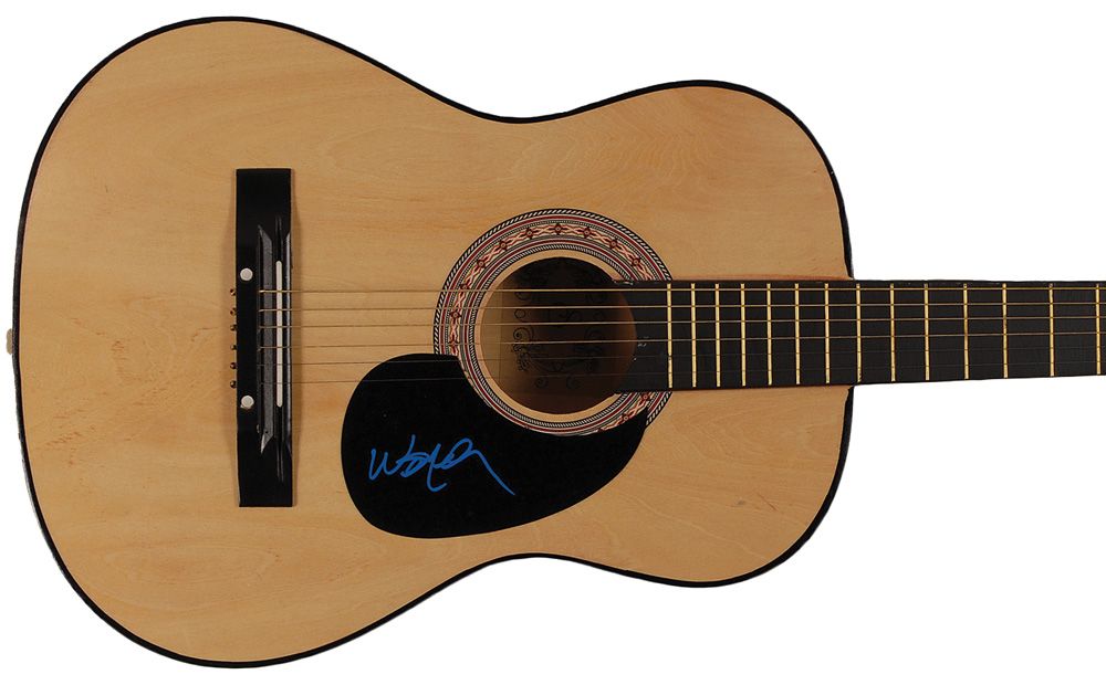 Natural wood-finish six-string acoustic guitar, signed on the black pickguard in blue ink. In fine condition. Oversized.