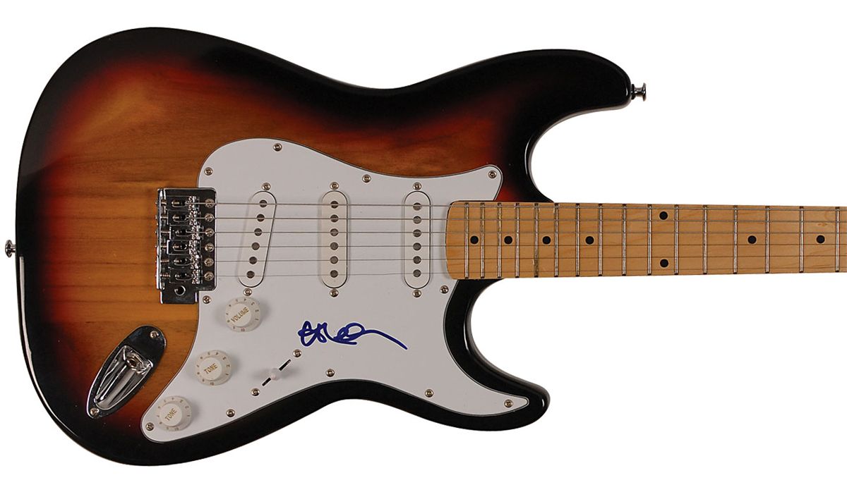 Sunburst-finish OSM ‘stratocaster-style’ electric guitar, signed on the white pickguard in blue felt tip. In fine condition. Oversized.