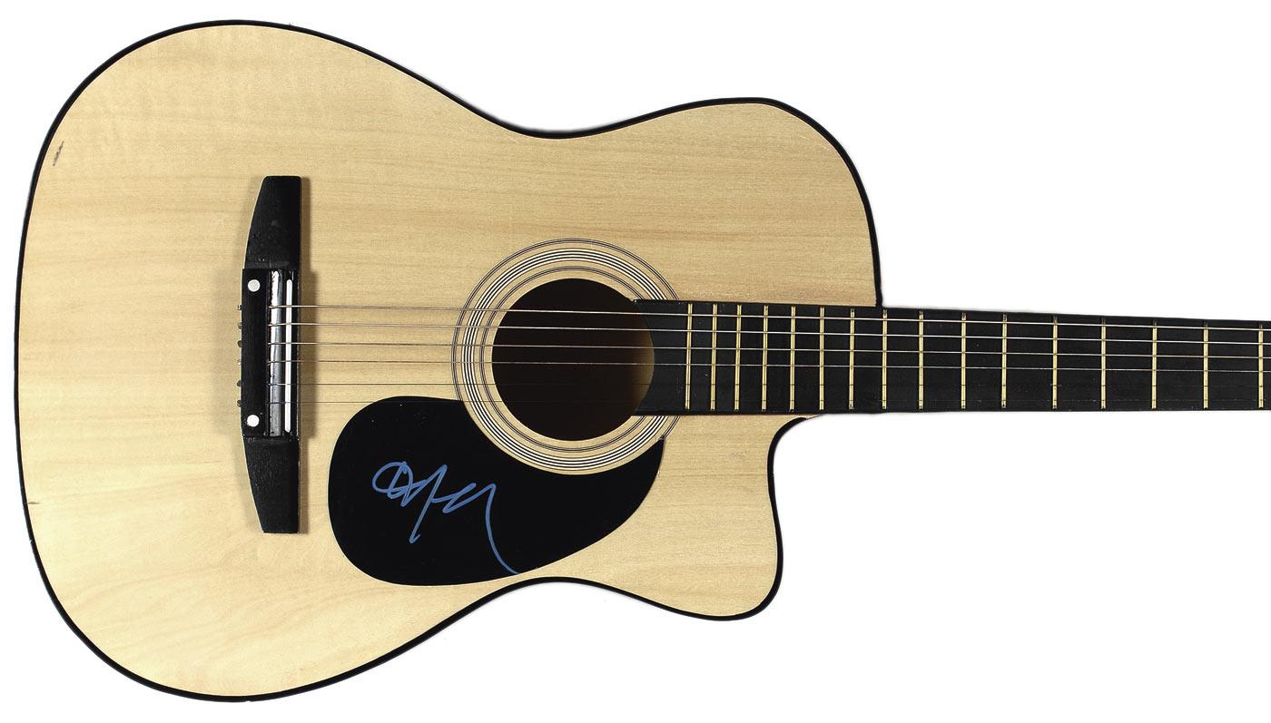 Natural wood-finish six-string acoustic guitar, signed on the black pickguard in blue ink. In fine condition. Oversized. RRAuction COA.