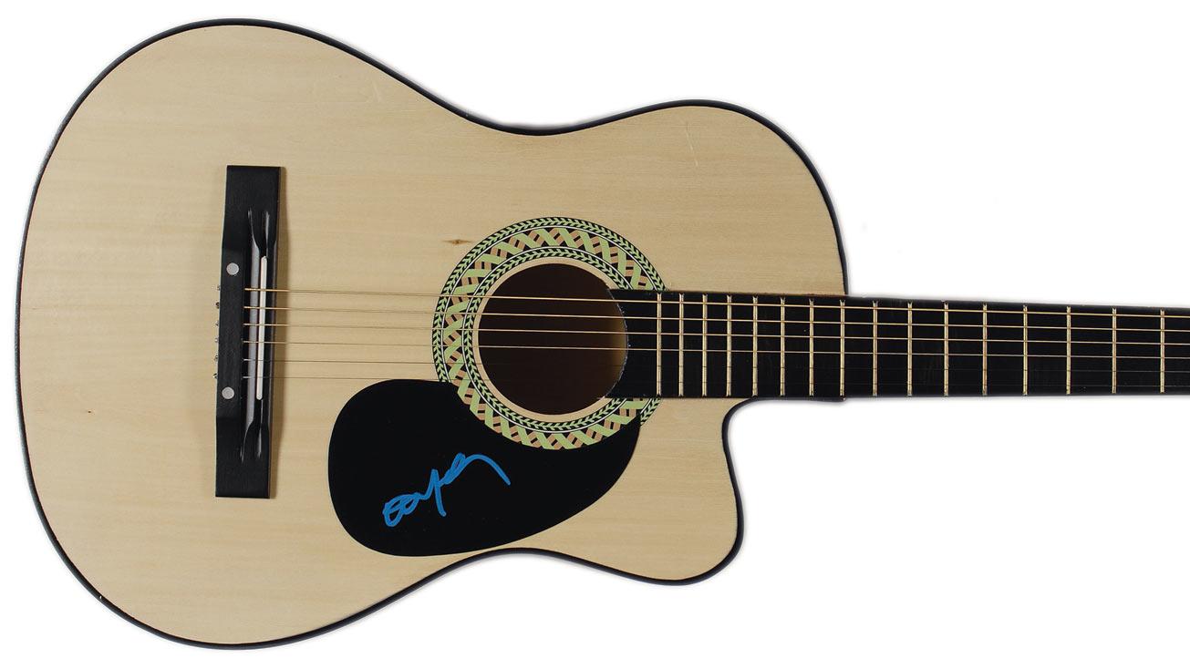 Natural wood-finish six-string acoustic guitar, signed on the black pickguard in blue ink by Nelson. In fine condition. Oversized.