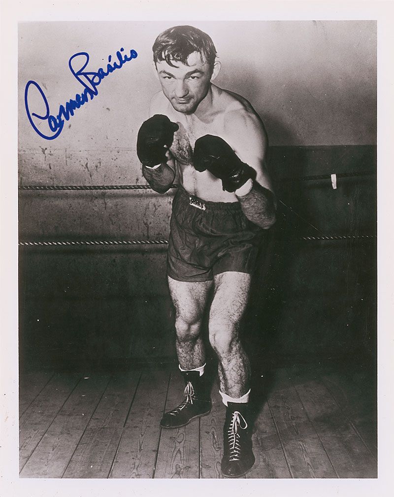Glossy 8 x 10 full-length photo of Willie Pep, signed in black felt tip; and a glossy 8 x 10 full-length photo of Basilio, signed in blue felt tip. In fine condition.