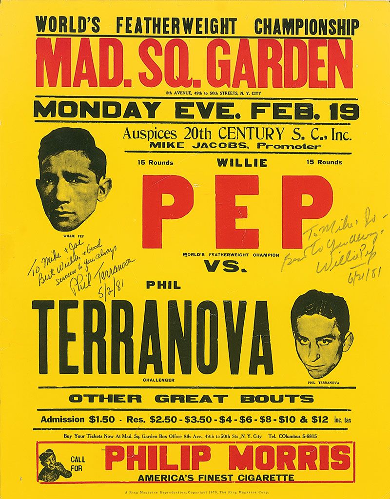 Color 11 x 14 preproduction poster for their championship fight at Madison Square Garden, signed and inscribed in black ballpoint, “To Mike & Joe, Best wishes & good success to you always, Phil Terranova,” and in black felt tip, “To Mike & Jo—Best to you always, Willie Pep, 6/21/81.” In fine condition, with a couple of light bends and creases, and light overall irregular ink adhesion to Pep’s signature and inscription.