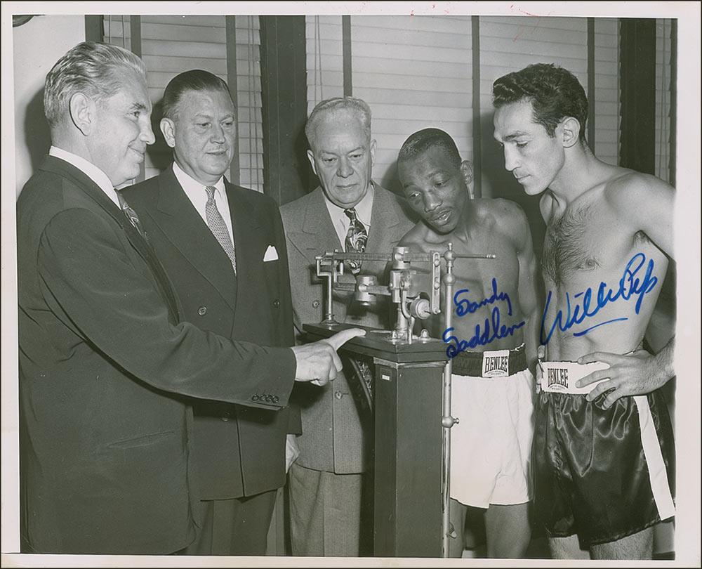 Vintage glossy 9 x 7.25 Associated Press photo of the 1951 weigh-in before their bout, signed in blue felt tip by both Pep and Saddler. Promotional information is affixed to the reverse. Some scattered light creases and surface marks, otherwise fine condition.