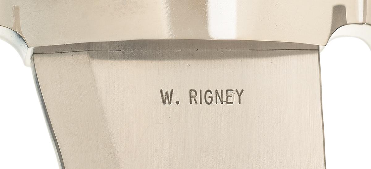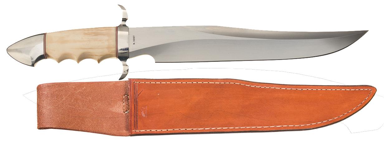 This bowie knife was handcrafted by Willie Rigney. Now retired, award winning knifemaker Willie Rigney created some of the finest and most detailed pieces of his generation. His knives were generally high tech period pieces that were done in a number of different styles. This Rigney knife features a 11 1/4 inch blade marked "W. RIGNEY". The finger groove ivory handle is accented with three thin red and white stripes at the guard and at the heavy rear bolster. OAL: 16 3/4". Complete with a "W. RIGNEY" marked leather sheath.