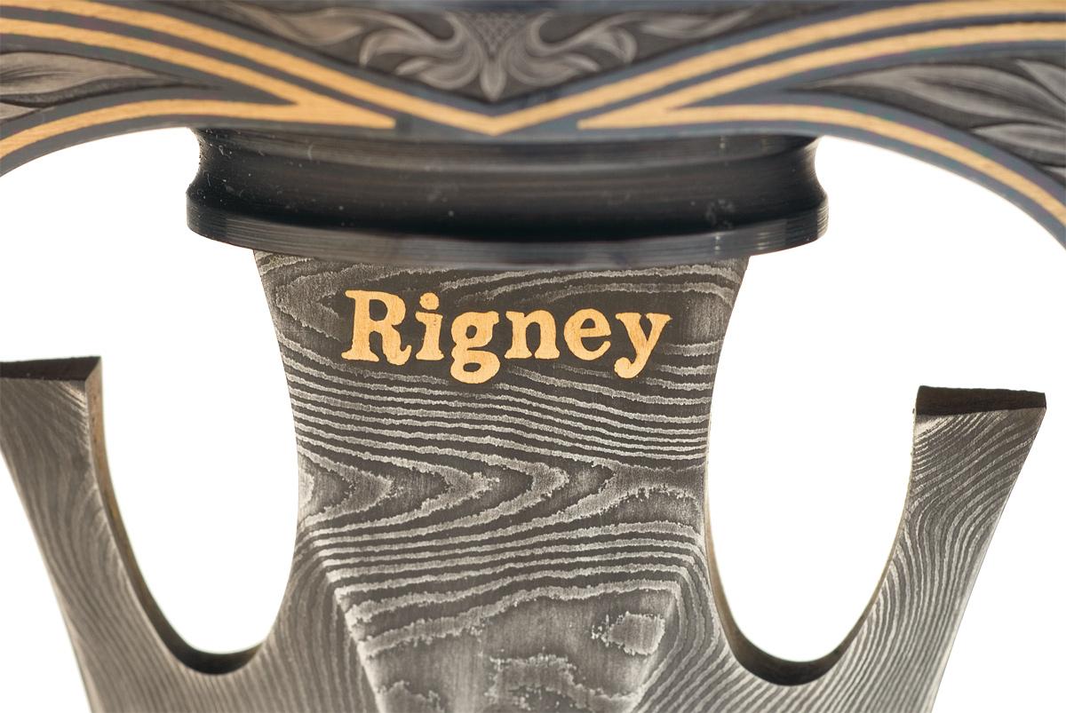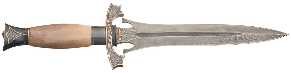 This stunning Damascus dagger was fabricated by Willie Rigney and engraved and gold inlaid by Julie Warenski. Now retired, award winning knife maker Willie Rigney created some of the finest and most detailed pieces of his generation. His knives were generally high tech period pieces that were done in a number of different styles. This Rigney dagger has an artfully shaped fuller Damascus blade with the artisan's name in gold, "Rigney". The exquisite stain finished engraving with gold inlaid borders is featured on the blue finished guard and pommel. The engraving has been signed by the master engraver, "J WARENSKI". Wife of the late Buster Warenski, Julie Warenski is a renowned engraver who continues to produce magnificent works of engraved art. The dagger has an ivory handle with a strikingly handsome grain pattern. OAL: 13 1/4".
