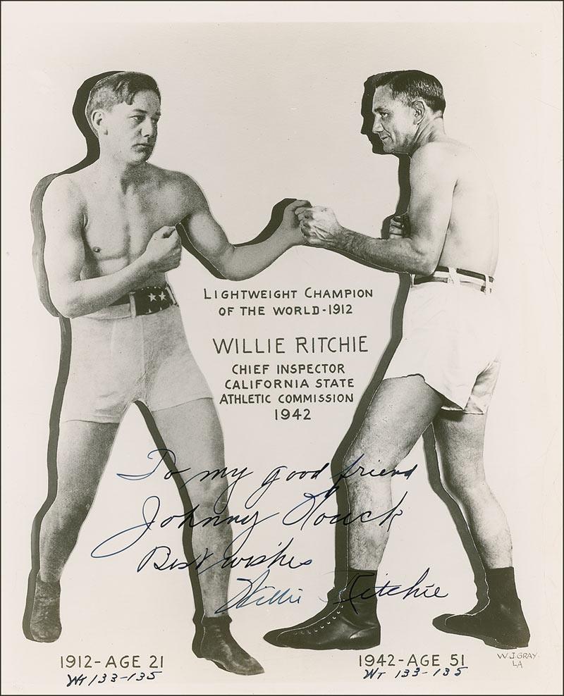 Born Gerhardt Anthony Steffen on February 13, 1891, in San Francisco, CA. Ritchie was working the corner for a friend when asked to sub for a prelim fighter who never showed. Fearing his mother would disapprove, he agreed only if his real name wasn't used. Hence, he turned pro as Willie Ritchie in 1907. Vintage glossy 8 x 10 photo featuring images of Ritchie in his prime and in his later years, signed and inscribed in fountain pen “To my good friend Johnny Rouck, Best wishes, Willie Ritchie.” In very good condition, with scattered creases, mainly to right edge, and light overall crazing to finish.