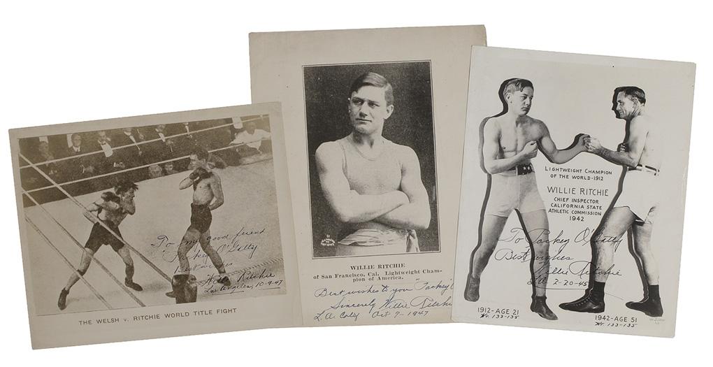 Born Gerhardt Anthony Steffen on February 13, 1891 in San Francisco, CA. Ritchie was working the corner for a friend when asked to sub for a prelim fighter who never showed. Fearing his mother would disapprove, he agreed only if his real name wasn't used. Hence, he turned pro as Willie Ritchie in 1907. Three different vintage signed photos, one glossy 8 x 10, one glossy 10 x 8, and one 8.5 x 11 lightweight photo, each signed and inscribed in fountain pen to former boxer Packey O’Gatty. Scattered light creases and surface marks to all three photos, otherwise fine condition.
