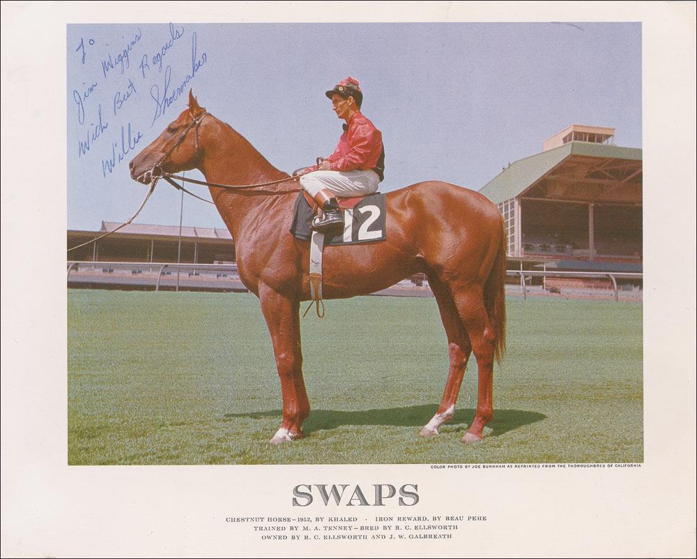 Legendary jockey (1931–2003). Color texture-finish 9.75 x 7.75 paperstock photo of the jockey atop Swaps, signed and inscribed in blue ballpoint “To Jim Wiggins, With Best Regards, Willie Shoemaker.” In fine condition, with a few dings and trimmed edges.