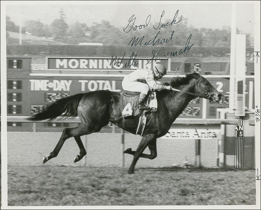 Glossy 10 x 8 photo of Shoemaker winning his 7000th race, signed and inscribed in black ink “Good luck Michael, Willie Shoemaker.” Promotional caption is affixed to reverse. Some scattered light creases and crop notation to right border, otherwise fine condition.