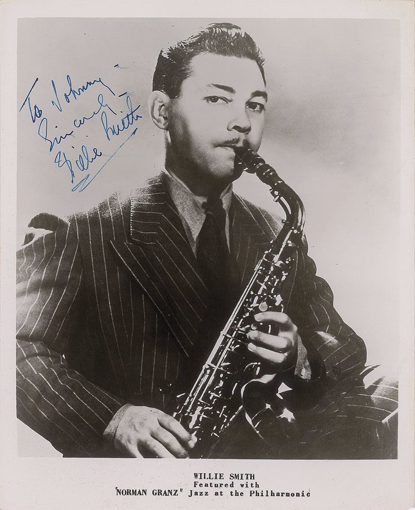 American alto saxophone player of the swing era (1910–1967) who also played clarinet and sang; he performed with notable players and ensembles like Jimmie Lunceford, Charlie Spivak, Harry James, Duke Ellington, and the Gene Krupa Trio. Vintage glossy 8 x 10 publicity photo of Smith playing his saxophone, signed and inscribed in fountain pen, "To Johnny, Sincerely, Willie Smith.” In fine condition.