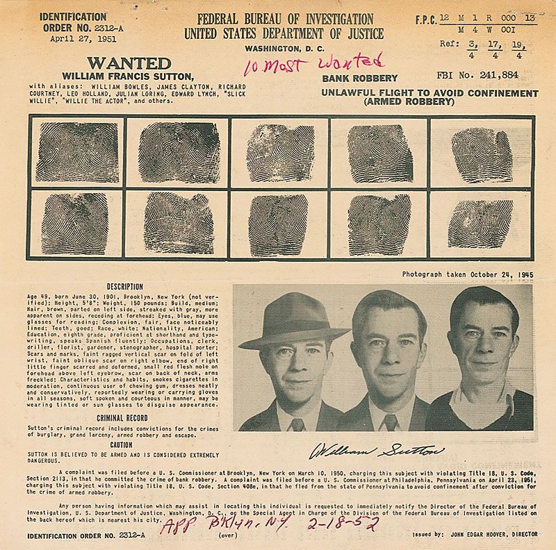 Master bank robber (1901–1980) nicknamed ‘The Actor’ for his success in eluding capture through the use of disguises and odd mannerisms. Original wanted poster issued by the FBI on April 27, 1951, 8 x 8, featuring images of Sutton’s fingerprints and mug shots, as well as a physical description. The poster charges him with “Bank Robbery” and “Unlawful Flight to Avoid Confinement (Armed Robbery),” and warns that “Sutton is believed to be armed and is considered extremely dangerous.” Also bears a couple original ink notations, including one denoting the suspect’s apprehension on February 18, 1952, in Brooklyn. In fine condition, with a central horizontal fold and tack holes to the top.