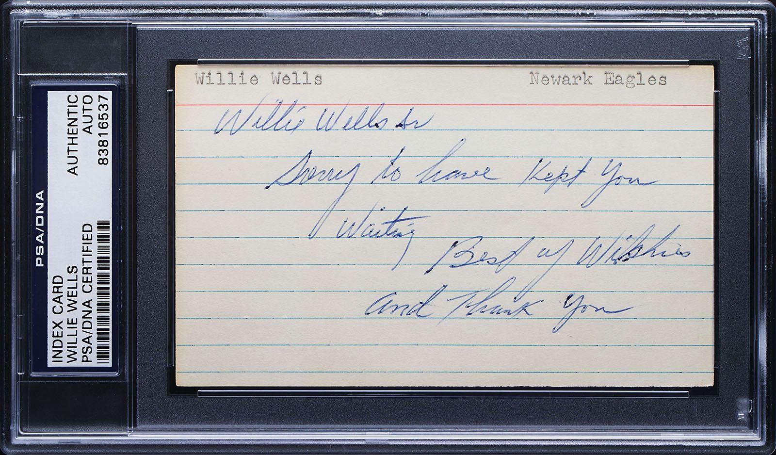 Ballpoint signature, "Willie Wells, Sr.,” on an off-white 5 x 3 lined card, to which he adds: "Sorry to have kept you waiting, Best of Wishes, and thank you." Encapsulated in a plastic PSA/DNA authentication holder. In fine condition.