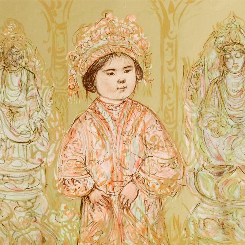 "Willie and Two Quan Yins" is a limited edition lithograph on deluxe Japon paper, numbered and hand signed by Edna Hibel (1917-2014). Includes Certificate of Authenticity! Measures approx. 21.5" x 13" (with border), 16" x 10" (image).