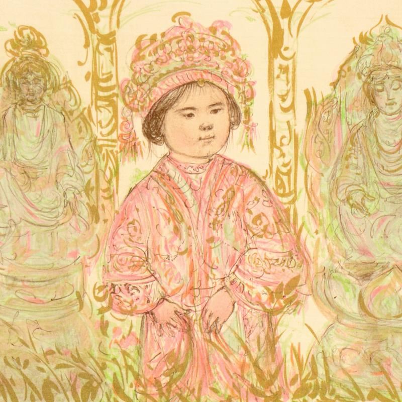 "Willie and Two Quan Yins" is a limited edition lithograph on paper by Edna Hibel (1917-2014), numbered and hand signed by the artist. Includes Certificate of Authenticity. Measures approx. 22" x 13" (border), 16" x 10" (image).