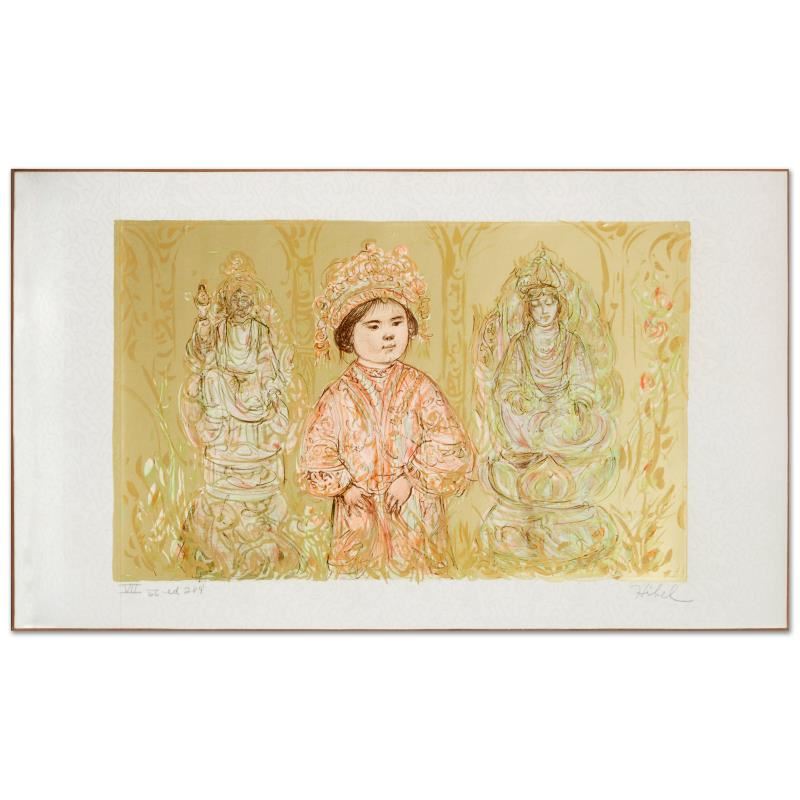 "Willie and Two Quan Yins" is a limited edition lithograph on deluxe Japon paper, numbered and hand signed by Edna Hibel (1917-2014). Includes Certificate of Authenticity! Measures approx. 21.5" x 13" (with border), 16" x 10" (image).