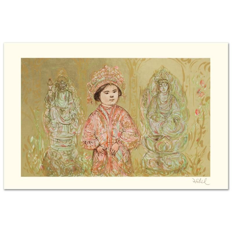 "Willie and Two Quan Yins" is a limited edition lithograph on paper, numbered and hand signed by Edna Hibel (1917-2014). Includes Certificate of Authenticity! Measures approx. 21.5" x 13" (with border), 16" x 10" (image).
