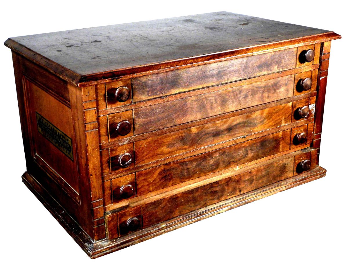 Willimantic Five Drawer Spool Cabinet, walnut. Fair to good condition. 28 X 16 X 18 inches.