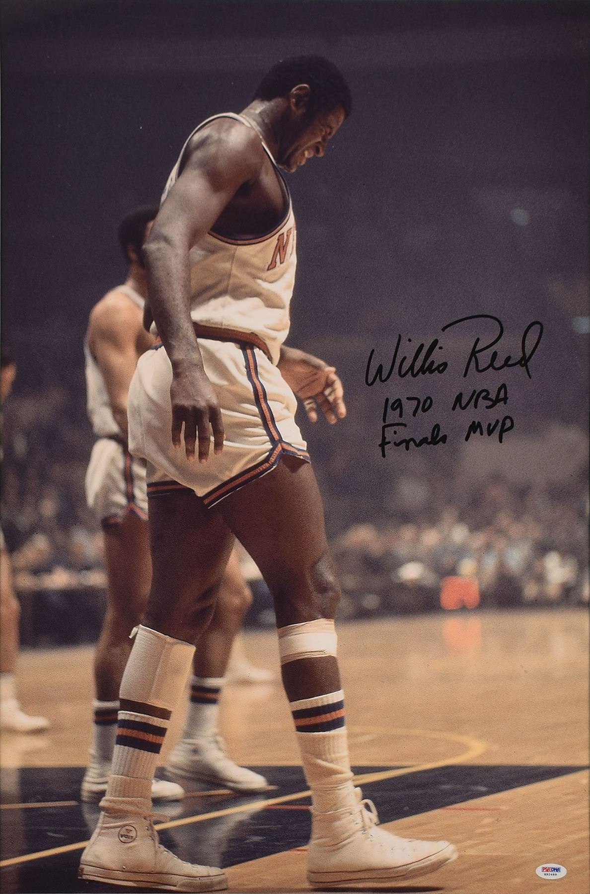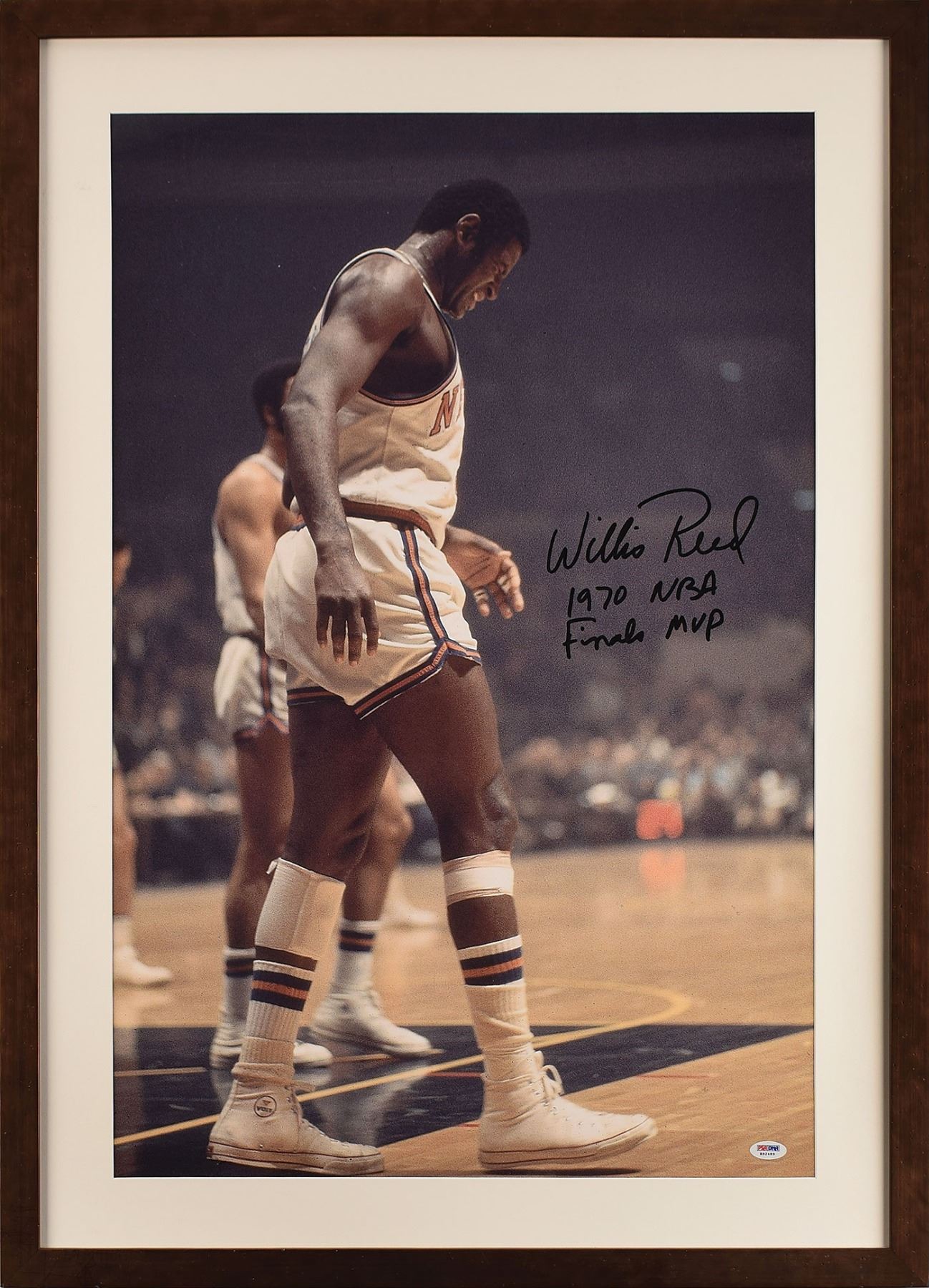 Massive color satin-finish 19.25 x 29.25 full-length photo of the hobbled New York Knicks center entering Game 7 of the 1970 NBA Finals, signed in black felt tip, "Willis Reed, 1970 NBA Finals MVP." Matted and framed to an overall size of 25.5 x 35.25. In fine condition, with a PSA/DNA label affixed to lower right corner.