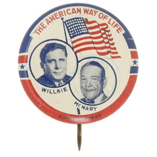 <B>Willkie and McNary Presidential Jugate Campaign Button,</B></I> 1, The American Way of Life. Excellent. <BR><BR><b>Shipping:</b> Miscellaneous Collectibles, Smal (<a target="_blank" href="http://www.heritageauctions.com/common/shipping.php">view shipping information</a>)