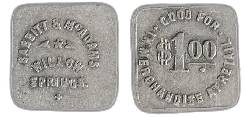 Obverse: Babbitt & McAdams / Willow / Springs; reverse: Good For / $1.00 /In Merchandise At Retail. Sq, Al,25mm, R10. Extremely fine condition.