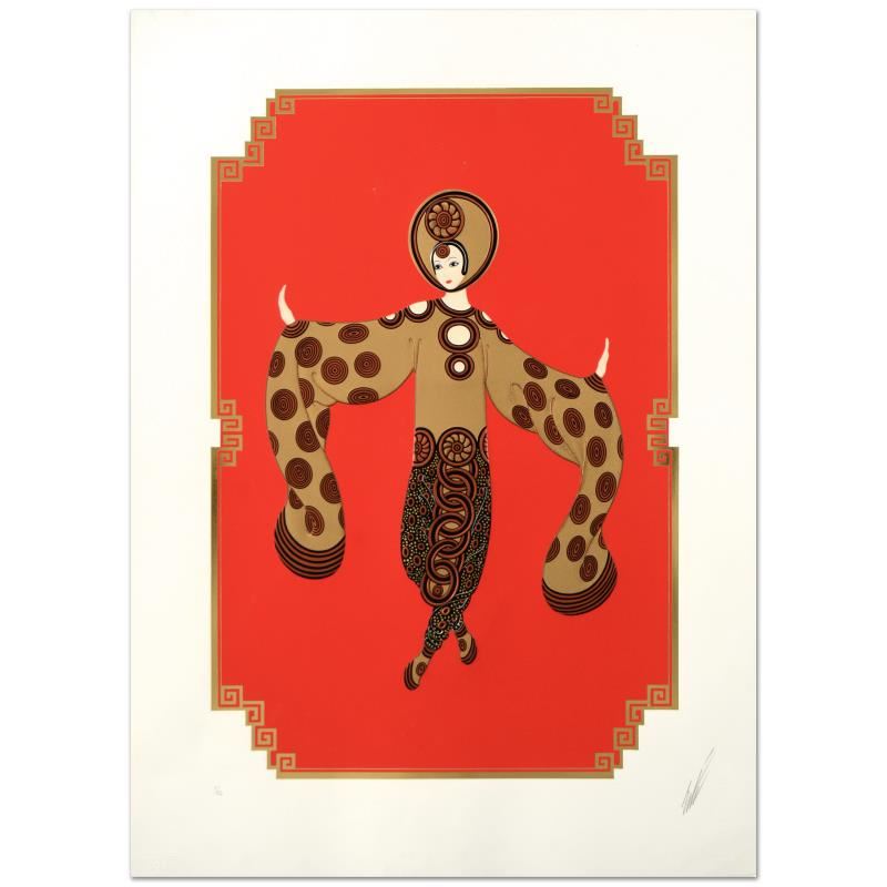 Willow Tree by Erte (1892-1990). Please see photos and description for all available information. "Willow Tree" is a limited edition serigraph on paper, numbered and hand signed by the artist. Includes Certificate of Authenticity! Measures approx. 20.5" x 28.5" (with border), 16" x 24" (image). ** Please note: there is a small crescent shaped crease in the red part of the image adjacent (left) to the womans face. **