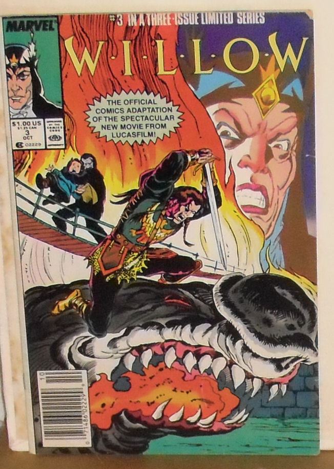 Willow,vol.1, #3 'in a three issue all offered here, the official comics adaptation of the spectacular new movie from Lucasfilm', by Marvel Entertainment, 1988 Printed in U.S.A., as is appears not read yet, with upper corner missing tiniest part of front cover, otherwise seems in near mint or mint as a comic book for your collection or start one now;