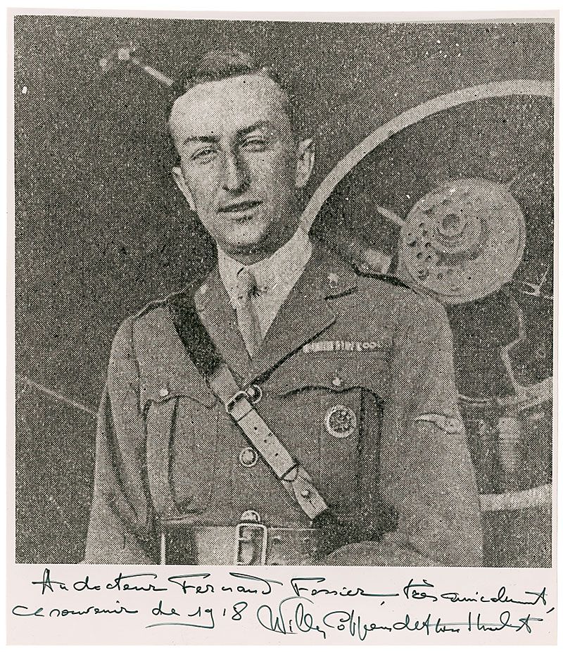 Belgian’s number one fighter ace (1892–1986) during WWI credited with 37 aerial victories. He lost his leg after being wounded by a bullet in 1918, but continued flying until 1940. Glossy 9.25 x 10.5 photo of Coppens in uniform, signed and inscribed in the lower border in black felt tip in French. In fine condition, with a slightly grainy quality to the image and slightly trimmed edges.