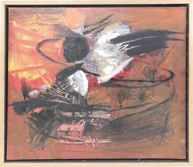 Willy Heeks (American 1951) Untitled, oil on masonite on plywood. "Willy Heeks 1985" on verso. [Sight: 17" H x 20" W; Frame: 18 1/2" H x 21 1/2" W]. Minor surface dirt, otherwise in fair condition.