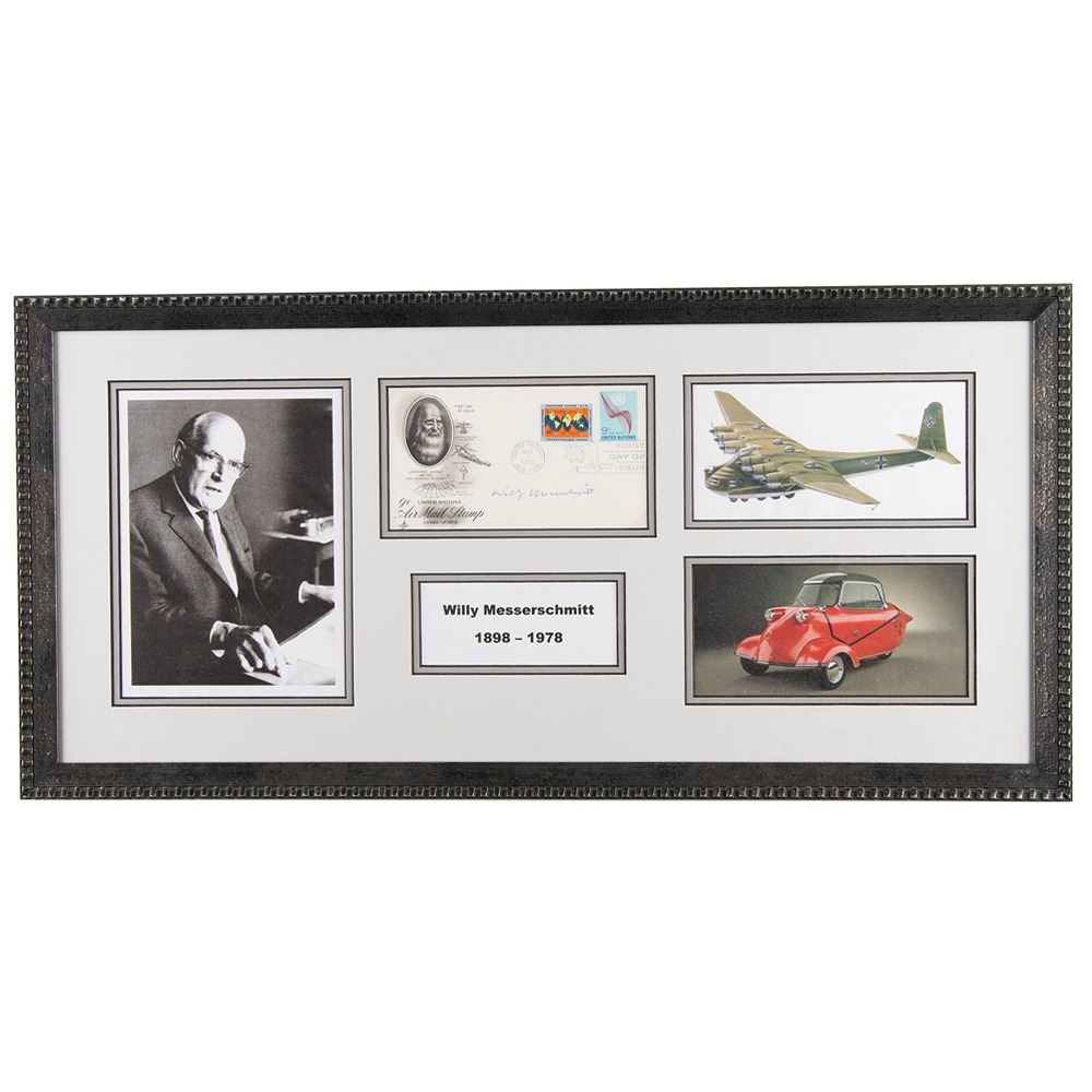 FDC with a cachet honoring Leonardo da Vinci as the first scientist of flight, signed in blue ballpoint by Willy Messerschmitt. Archivally double-matted and framed with three images and a caption to an overall size of 25.25 x 12.25. In fine condition.