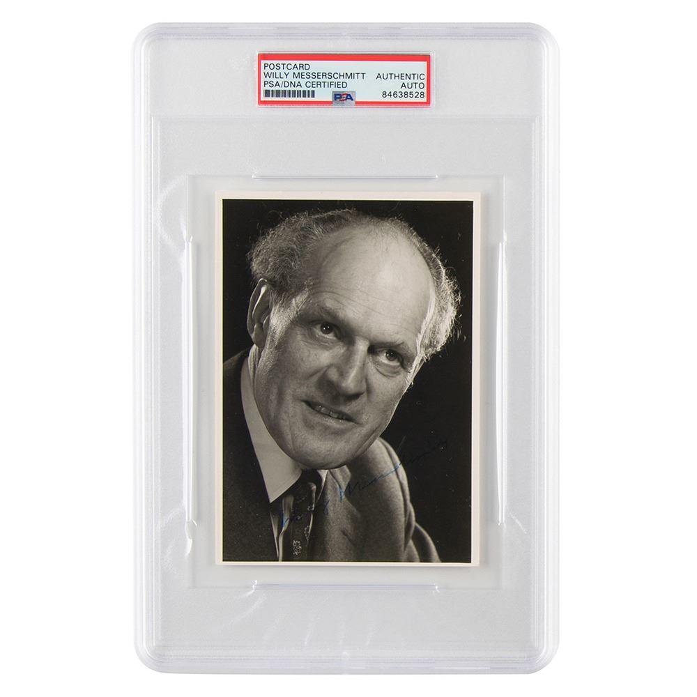 Vintage pearl-finish 4 x 5.75 postcard photo of Willy Messerschmitt in an up-close pose, signed in blue ballpoint. Reverse bears a "Foto-Studio Meinen" stamp. In very good to fine condition, with some creasing to the right side, touching Messerschmitt's hair. Encapsulated in a PSA/DNA authentication holder.