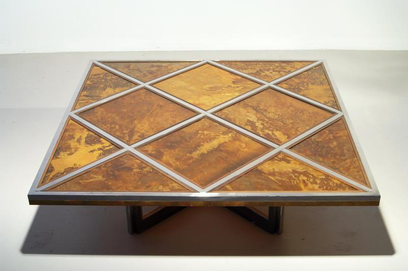 18h x 55w x 55d inches, chrome, bronze, aluminum, gold painted glass bronze and copper legs and the base are in very good condition, 3 gold-oxid painted glas tiles are broken, restored fixed