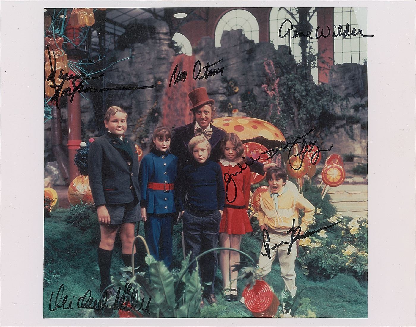 Color glossy 14 x 11 full-length photo of Willy Wonka standing with all of his lucky Golden Ticket winners, signed in black felt tip by Gene Wilder, Peter Ostrum, Julie Dawn Cole, Denise Nickerson, Paris Themmen, and Michael Bollner. In fine condition, with some signature contrast.