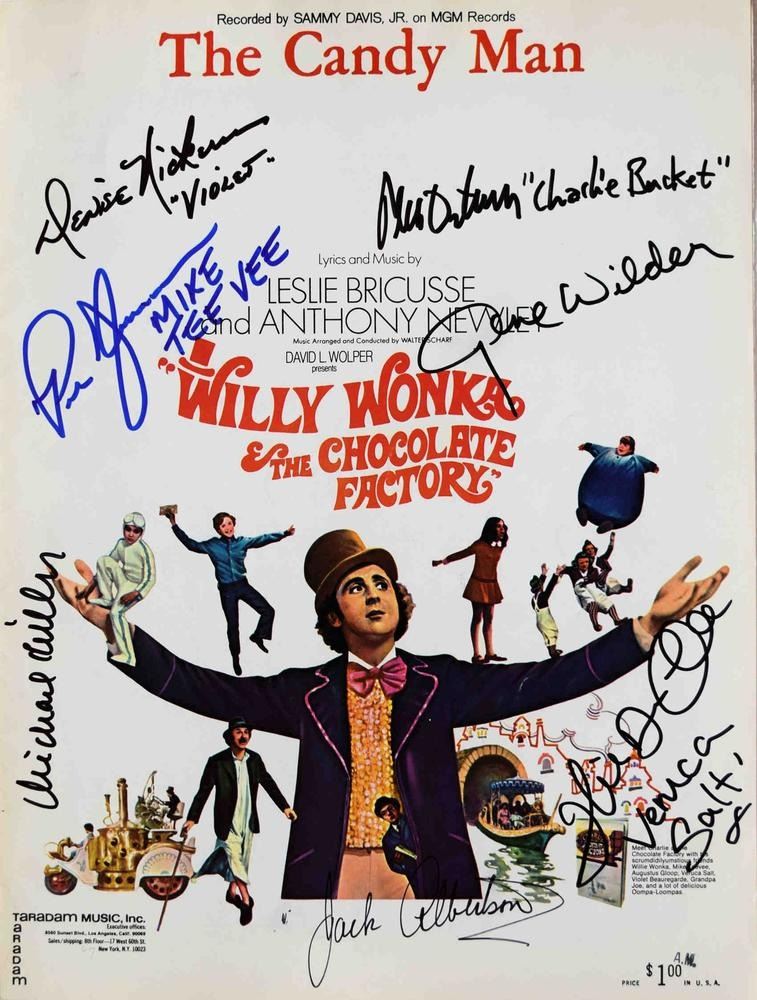 Sheet Music from the Movie Willy Wonka & The Chocolate Factory. Signed: Gene Wilder, Paris Themmen Mike Tee Vee, Peter Ostrum Charlie Bucket, Julie Dawn Cole Veruca Salt, Denise Nickerson, Michael Böllner & Jack Albertson.