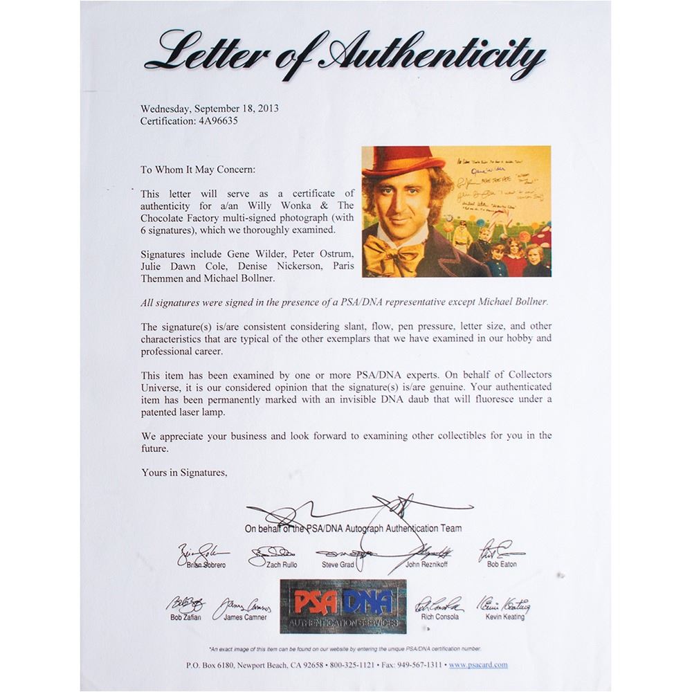 Color satin-finish 30 x 20 photo of Willy Wonka and his Chocolate Factory visitors, signed in blue felt tip by Gene Wilder and black felt tip by Michael Bollner, Julie Dawn Cole, Peter Ostrum, and Paris Themmen. All but Wilder add a quote from the film. Rolled and in fine condition, with a somewhat grainy image quality and a PSA/DNA label affixed to the lower corner. Accompanied by a full letter of authenticity from PSA/DNA, erroneously stating that Denise Nickerson also signed.