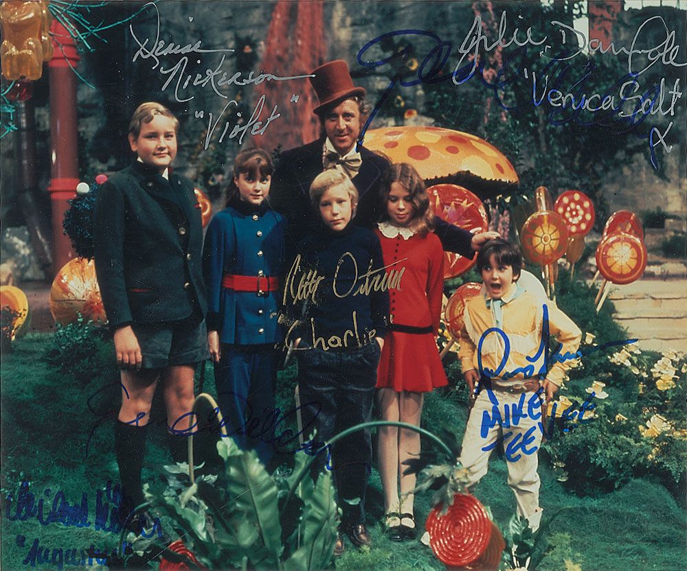 Color glossy 10 x 8 signed photo of Willy Wonka in his factory with the five Golden Ticket Winners, signed in ink and felt tip by Michael Bollner, Denise Nickerson, Peter Ostrum, Julie Dawn Cole, and Paris Themmen, all adding their character names, and si