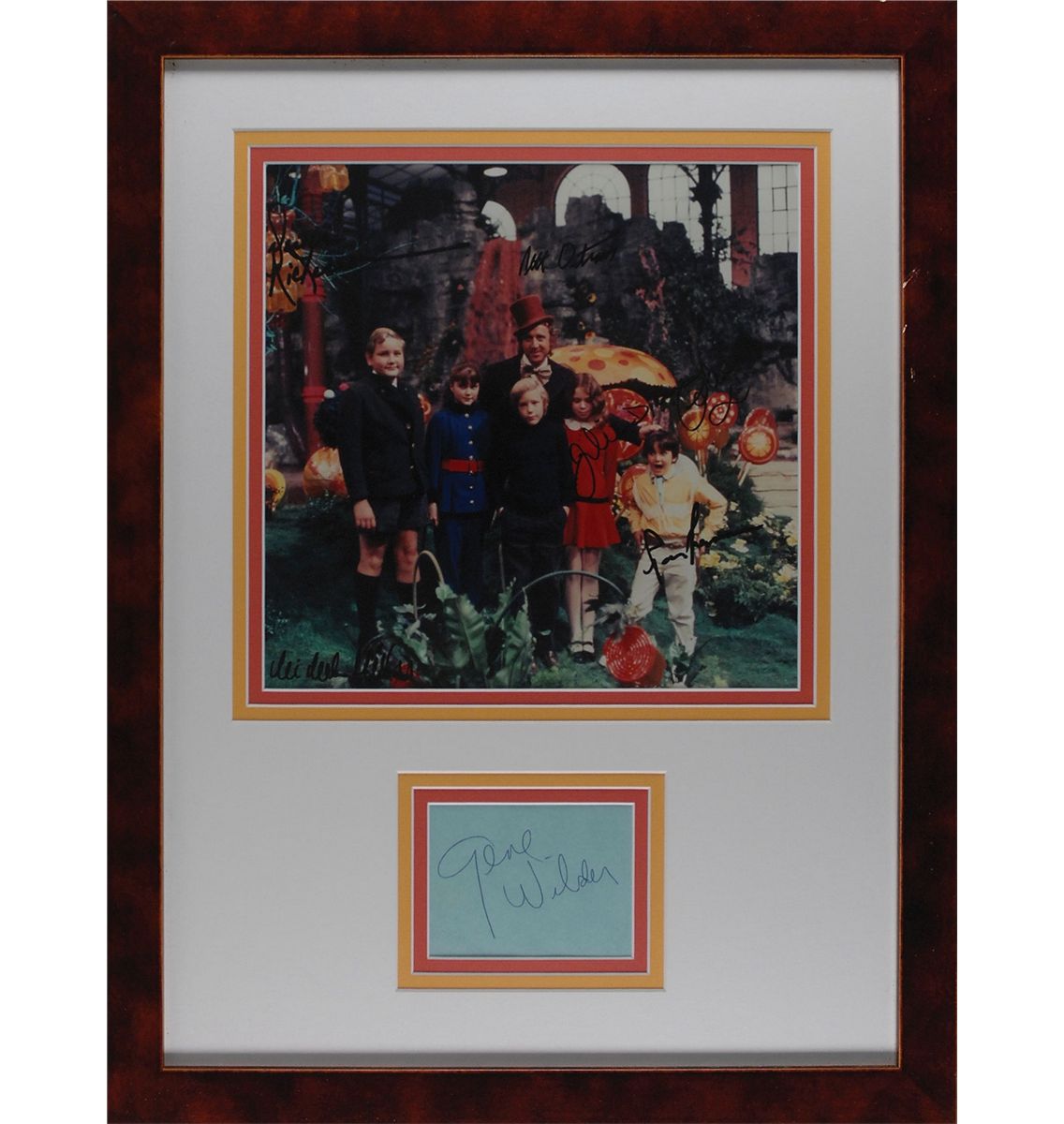Fantastic color glossy 10.5 x 10 photo of Wonka with the five lucky ticket winners, signed in black felt tip by Paris Themmen, Michael Bollner, Denise Nickerson, Peter Ostrum, and Julie Dawn Cole. Nicely double-matted with a ballpoint signature, “Gene Wilder,” on a light blue 4 x 3 album page to an overall size of 16.75 x 22. Accompanied by signing photos of each of the five grown kids. In overall fine condition.