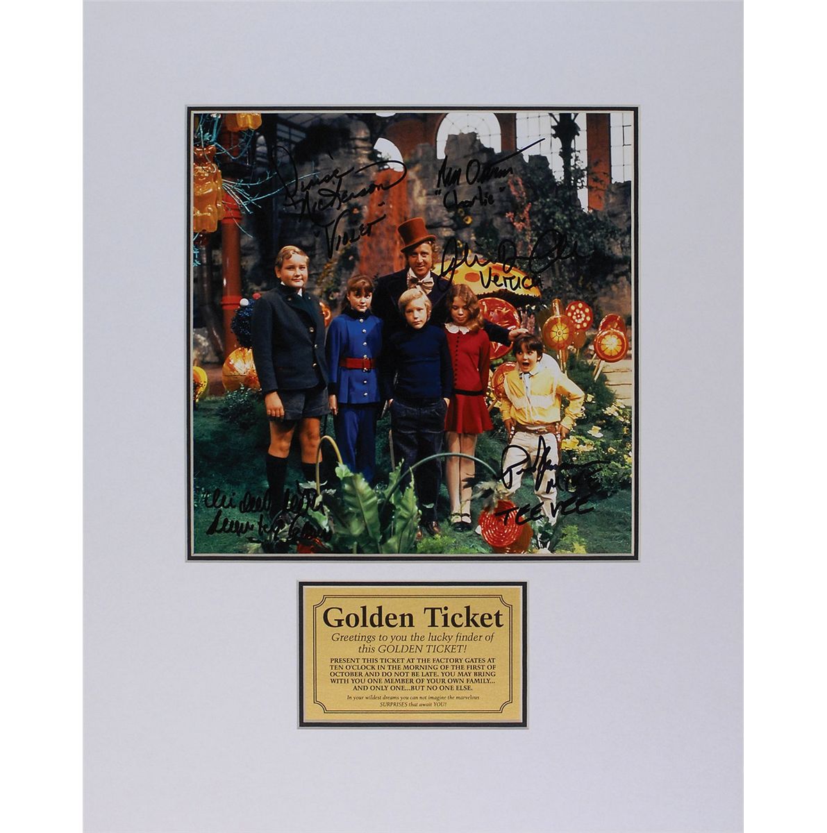 Color glossy 10.5 x 10.5 photo of Wonka with the five lucky ticket winners, signed in black felt tip by Paris Themmen, Michael Bollner, Denise Nickerson, Peter Ostrum, and Julie Dawn Cole. Nicely double-matted with a ‘golden ticket’ to an overall size of 16 x 20. In overall fine condition.
