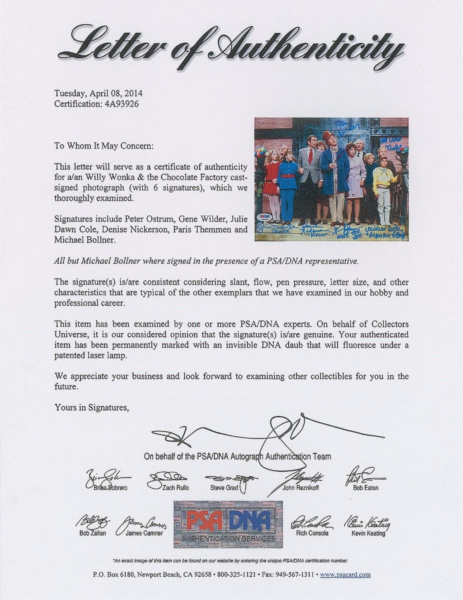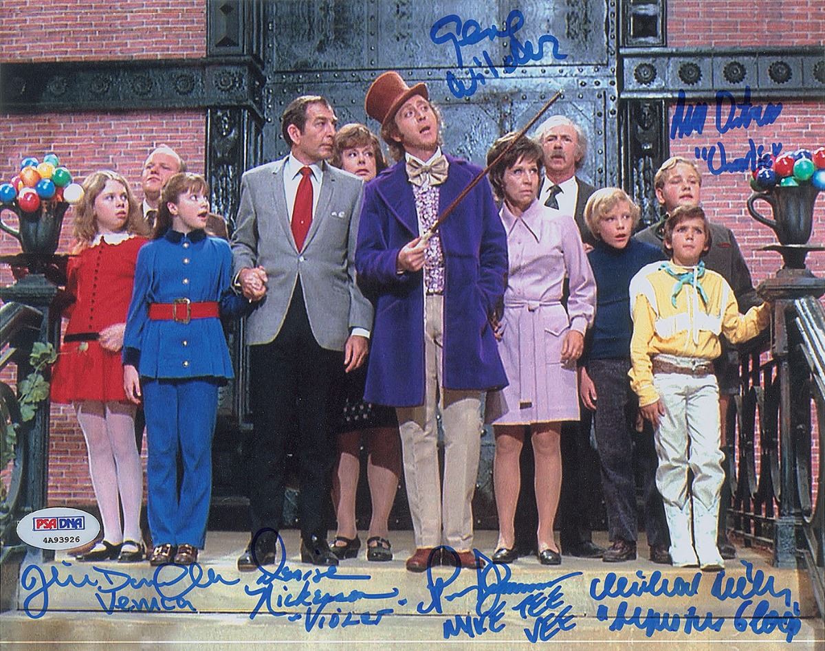 Color satin-finish 10 x 8 photo of Willy Wonka giving a tour of his enormous chocolate factory, signed in blue felt tip by Gene Wilder, Peter Ostrum, Julie Dawn Cole, Denise Nickerson, Paris Themmen, and Michael Bollner, with all but Wilder adding their respective character names from the 1971 film. In very fine condition, with a slightly grainy quality to the image. Accompanied by a full letter of authenticity from PSA/DNA.