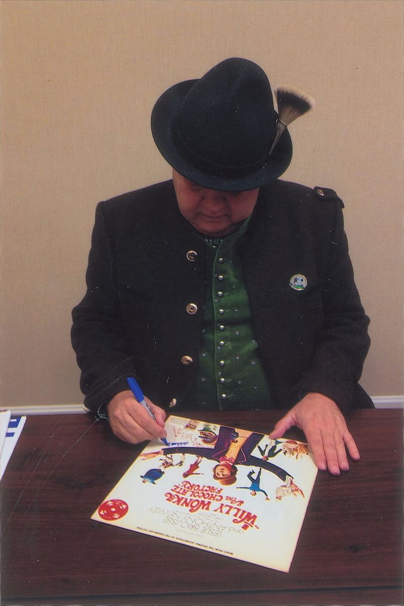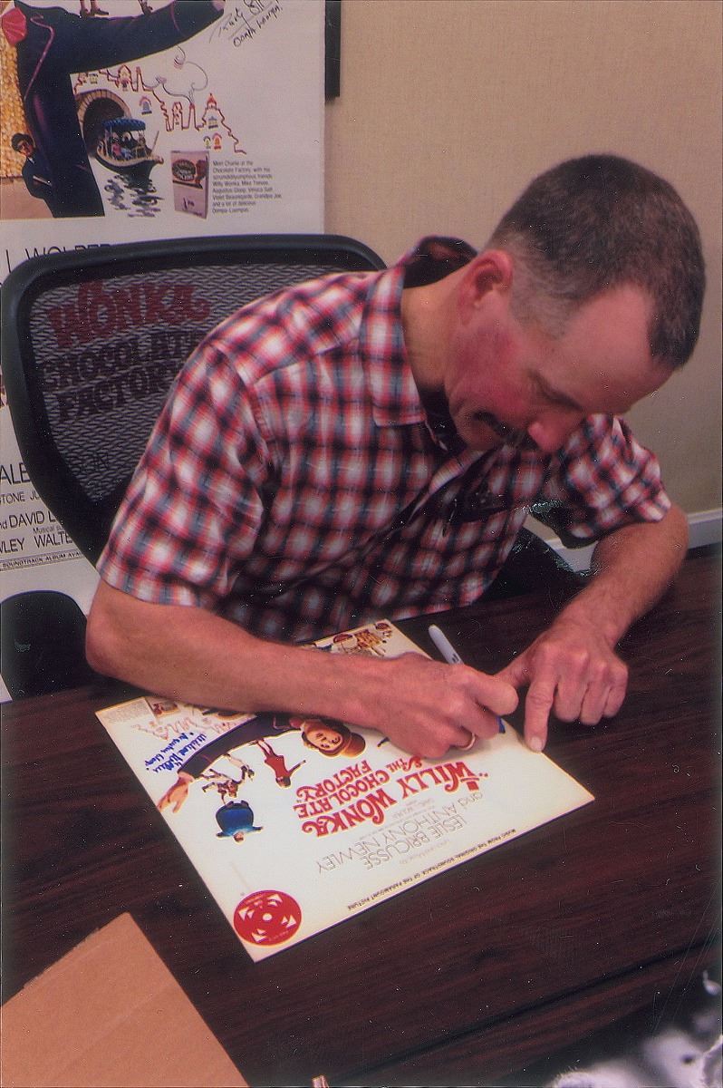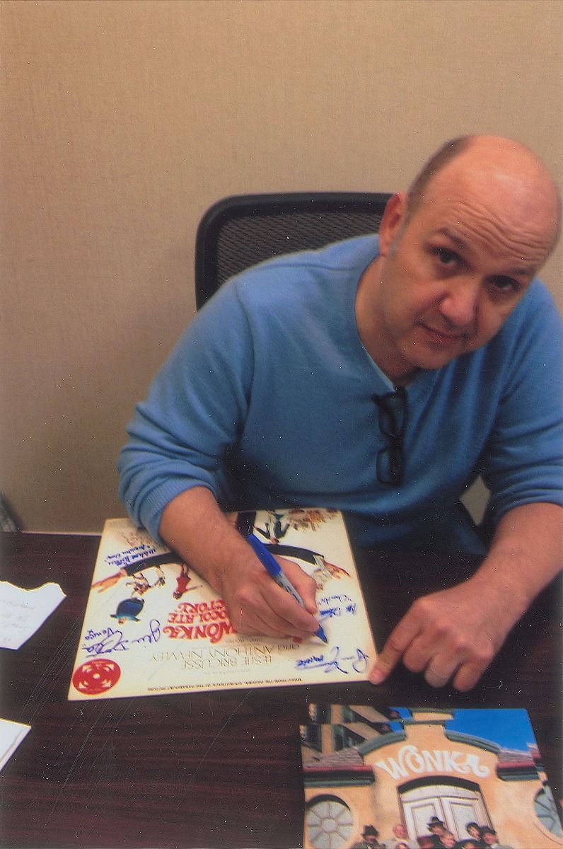 Willy Wonka and the Chocolate Factory album signed on the front cover in blue felt tip by the leading man, “Gene Wilder,” and by the actors who portrayed all five children, each adding their character’s name: “Peter Ostrom, ‘Charlie,’” “Julie Dawn Cole, ‘Veruca,’” “Paris Themmen, Mike Teevee,” “Michael Bollner, ‘Augustus Gloop,’” and “‘Violet,’ Denise Nickerson.” In fine condition, with a cut to the lower left. The record is included. Accompanied by photos of four of the actors signing the album; consignor notes this was signed by Wilder in a private signing and by the others in person in New Jersey on October 26, 2013.