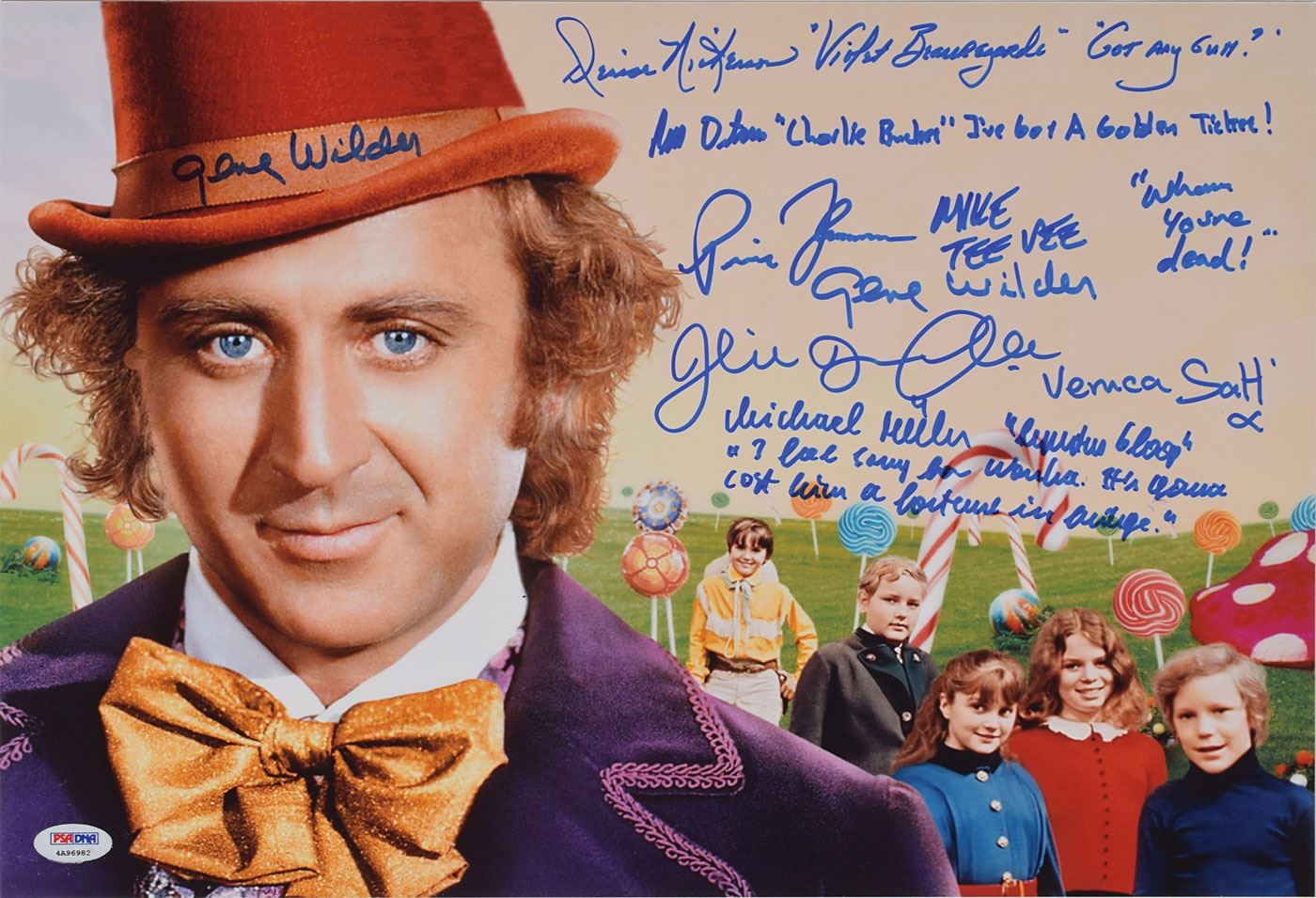 Color satin-finish 17 x 12 photo of Willy Wonka and his lucky golden ticket guests, signed in blue felt tip, "Gene Wilder," who signs twice, "Peter Ostrum, 'Charlie Bucket,' I've got a golden ticket!," "Julie Dawn Cole, 'Veruca Salt,'" "Denise Nickerson, 'Violet Beauregarde,' 'Got any gum?,'" "Paris Themmen, Mike Teevee, 'Wham you're dead!,'" and "Michael Bollner, 'Augustus Gloop,' 'I feel sorry for Wonka. It's gonna cost him a fortune in fudge.'" In fine condition. Accompanied by a full letter of authenticity from PSA/DNA.