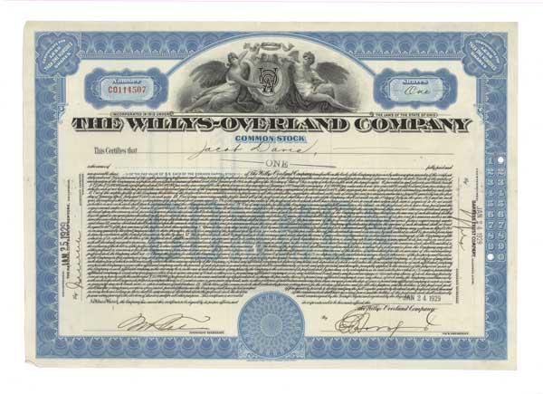 1928, Ohio. Stock certificate for one share. Blue/Black. Engreved vignette of company logo flanked by allegorical figures. Uncancelled and fine. John North Willys bought the Overland Automotive Division of Standard Wheel company in 1908 rechristened it the Willys-Overland Motor Company. Willys-Overland made both automobiles and trucks before being reorganized in 1936 after a depression bankruptcy as the Willys-Overland Motors Inc.