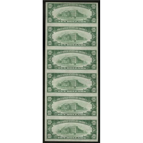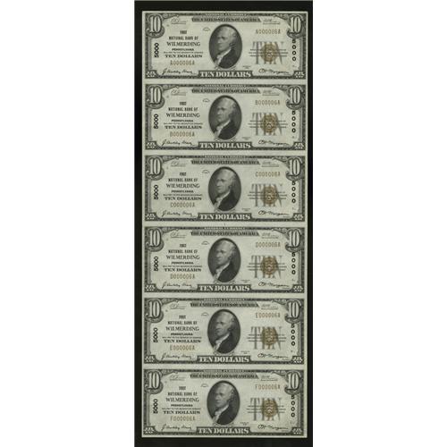 <B>Wilmerding, PA</B></I> - $10 1929 Ty. 1 <B>First NB</B></I> Ch. # 5000 Uncut Sheet<BR>This is a most attractive all 6 serial number uncut sheet from this even charter number bank. Each note has a light bend, but this sheet still has earned the <B>Choice Crisp Uncirculated</B></I> grade. We sold an identical looking serial number 10 uncut sheet for this denomination on this bank in April 2006 for $4600.<BR><BR><b>Shipping:</b> Coin/Currency (<a target="_blank" href="http://www.heritageauctions.com/common/shipping.php">view shipping information</a>)