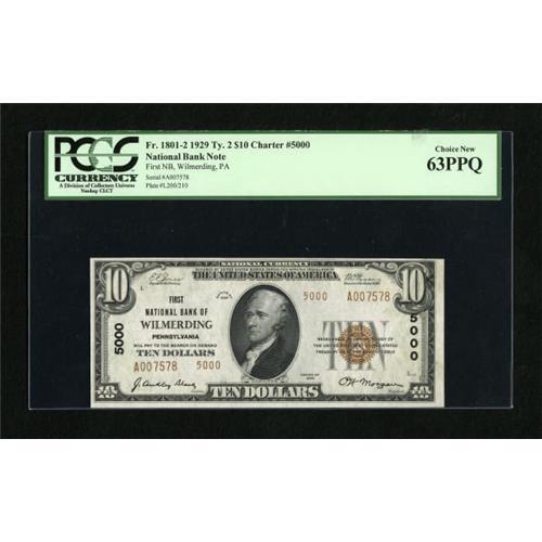 <B>Wilmerding, PA</B></I> - $10 1929 Ty. 2 <B>First NB</B></I> Ch. # 5000<BR> Dark inks are found on this $10 from an even thousand charter number bank. This would be a nice note for type. <B>PCGS Choice New 63PPQ.</B></I><BR><BR><b>Shipping:</b> Coins & Currency (<a target="_blank" href="http://www.heritageauctions.com/common/shipping.php">view shipping information</a>)